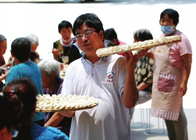 “孝道大餐”現(xiàn)場(chǎng),史世江和黨員義工一起為老人們端餃子