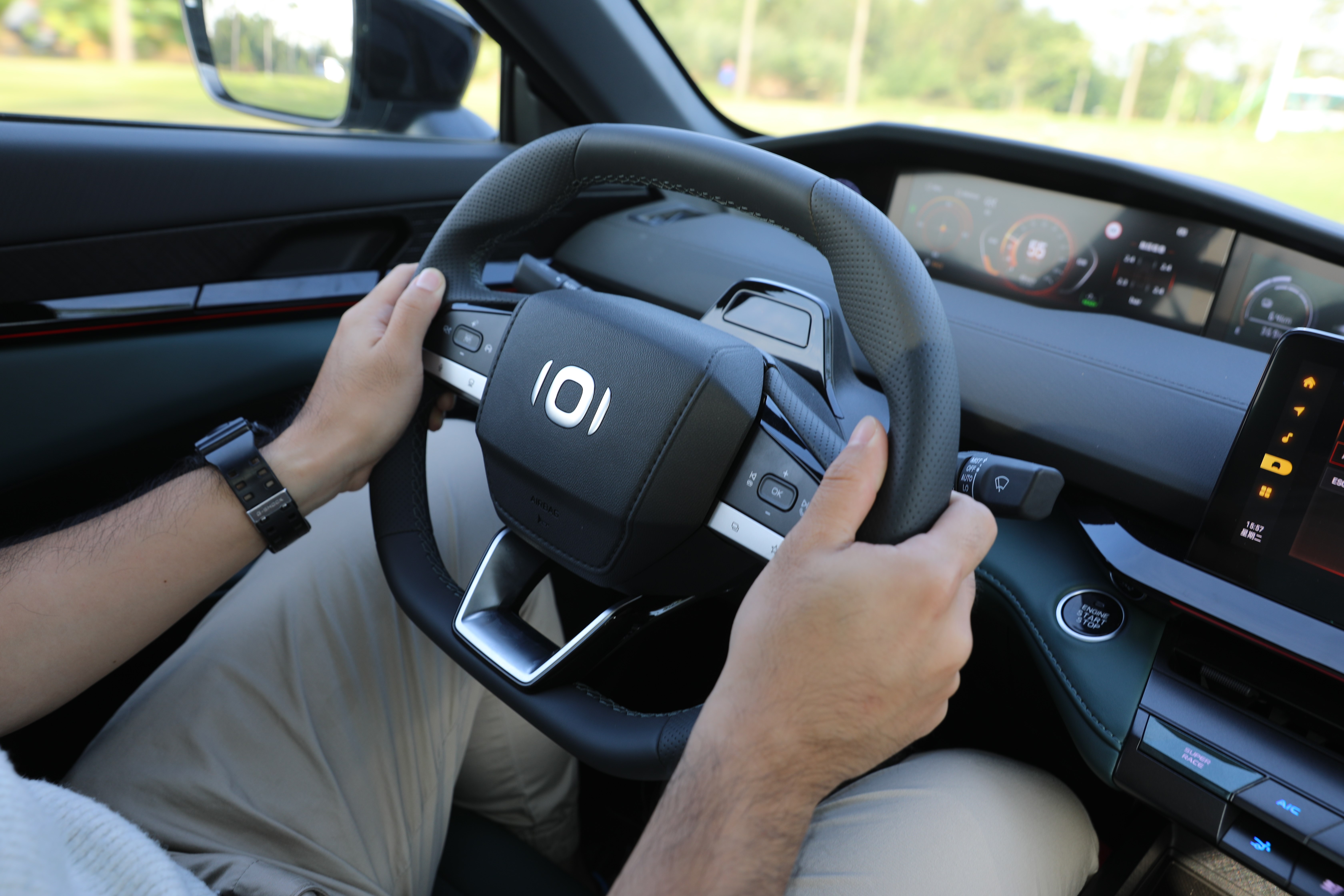 智能驅(qū)動模式能夠幫助車輛在不同電量狀態(tài)下,以最優(yōu)的驅(qū)動結(jié)構(gòu)對動力進行分配,而當(dāng)筆者啟動SUPER RACE模式,首先映入眼簾的是儀表盤、中控屏切換到更激進的界面UI,其次,車輛的動力進入到嚴(yán)陣以待的狀態(tài),油門響應(yīng)更為積極,配合模擬聲浪,整車的運動氣質(zhì)完全展現(xiàn)出來。