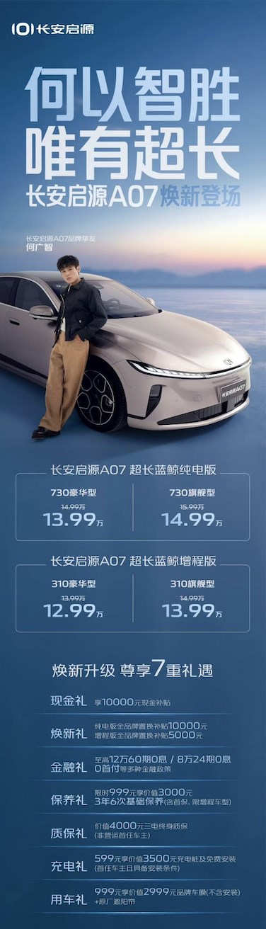 9月10日,長安啟源A07超長藍(lán)鯨純電版/增程版煥新登場,共推出4款車型,長安啟源A07超長藍(lán)鯨純電版 730豪華型、730旗艦型售價(jià)為13.99萬元、14.99萬元;長安啟源A07超長藍(lán)鯨增程版310豪華型、310旗艦型售價(jià)為12.99萬元、13.99萬元,并提供七重誠意大禮,全面滿足用戶對(duì)于越級(jí)價(jià)值的需求。