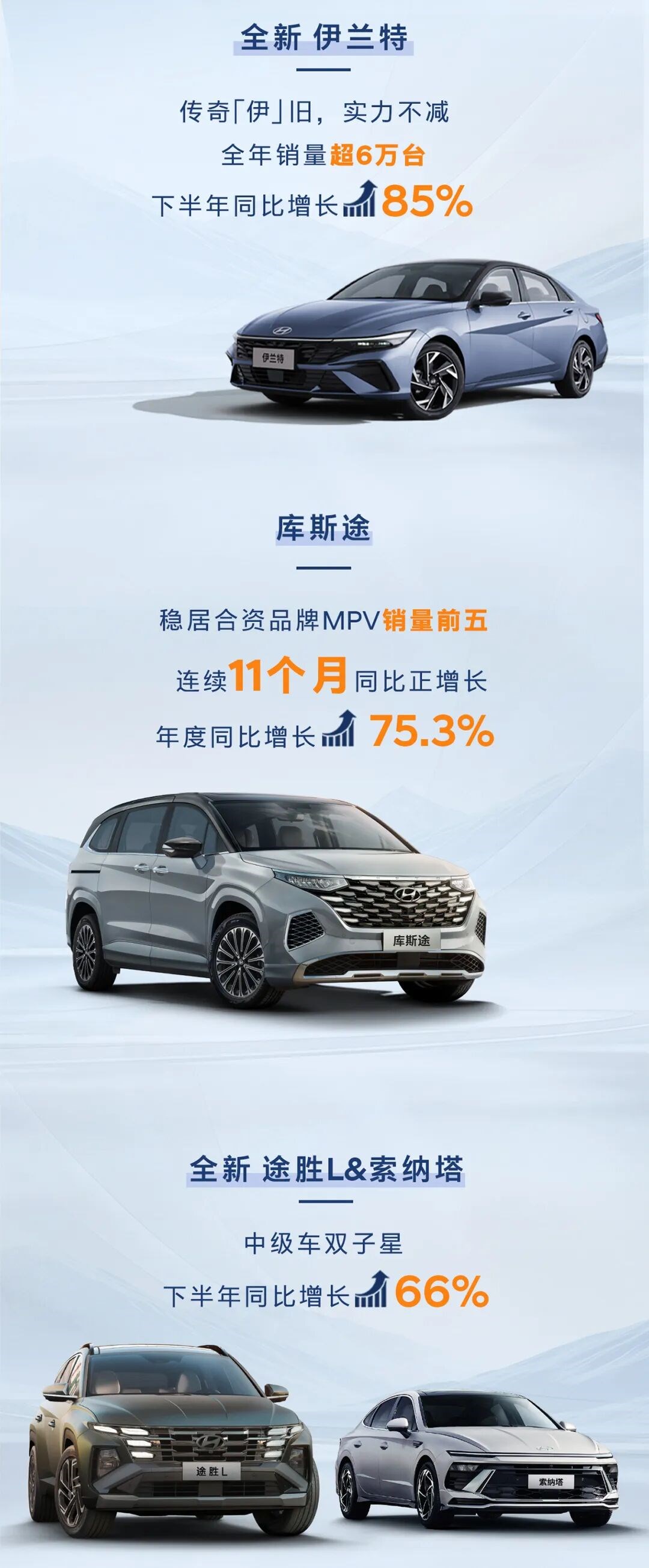 具體來看,燃油車基本盤持續(xù)夯實(shí):家用MPV車型庫斯途憑借精準(zhǔn)的市場定位,穩(wěn)居合資品牌MPV銷量前五,連續(xù)11個(gè)月實(shí)現(xiàn)同比正增長,年度增幅達(dá)75.3%;索納塔與途勝組成的“中級(jí)車雙子星”下半年銷量同比增長66%,成為中級(jí)車市場的“中堅(jiān)力量”;經(jīng)典家轎伊蘭特延續(xù)“家轎王”口碑,全年銷量超6萬輛,下半年同比增幅高達(dá)85%,以經(jīng)濟(jì)省油、皮實(shí)耐用的優(yōu)勢持續(xù)收獲家庭用戶青睞。