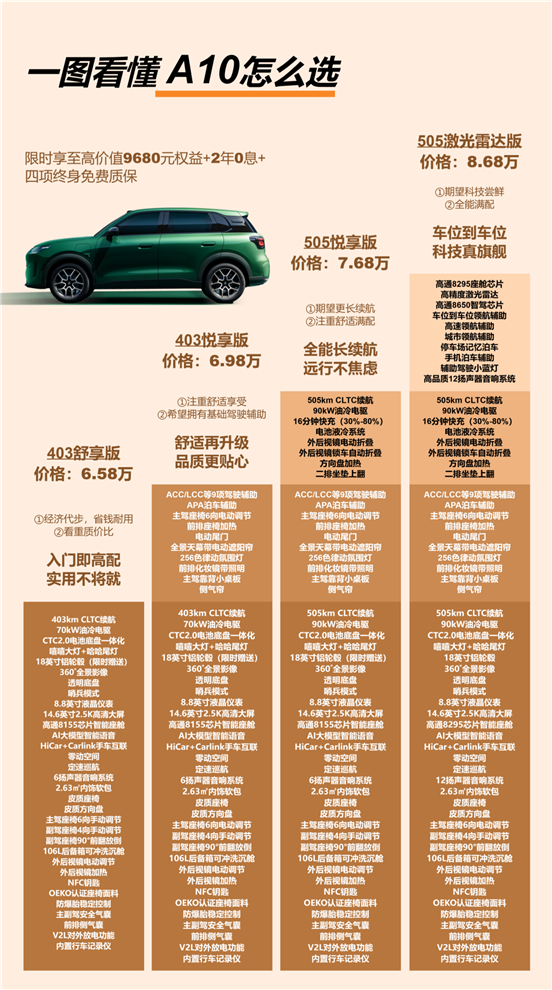 零跑 A10 一共四個版本,我給大家捋清楚每個版本的差異,直接對號入座就行: